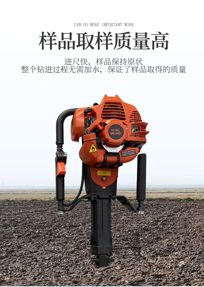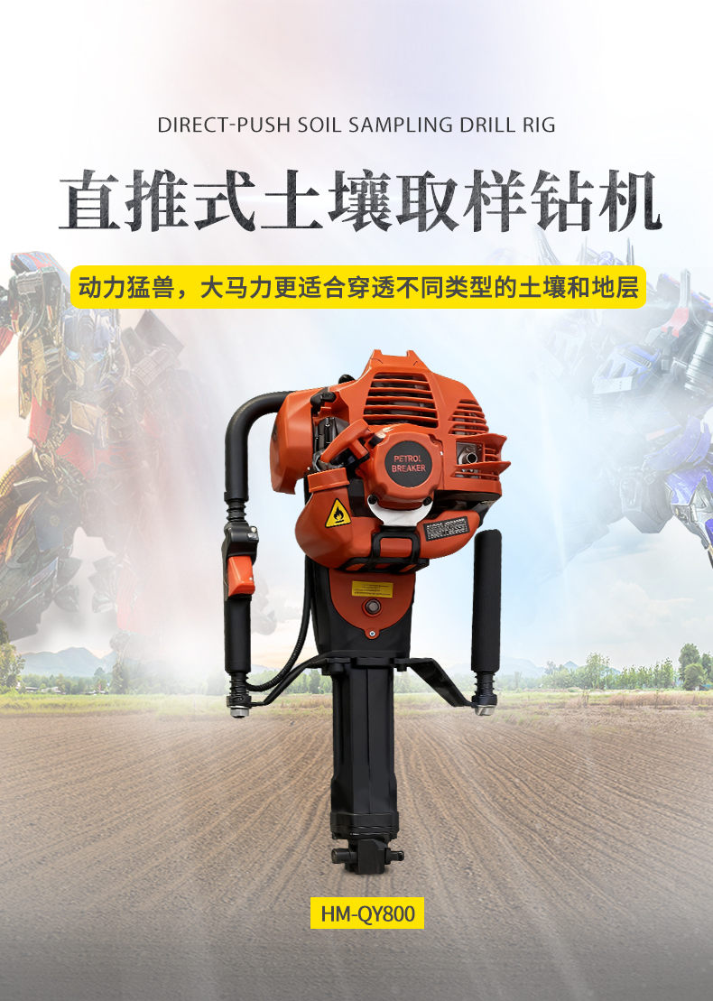 HM-QY800單人手持式土壤取樣鉆機是在參考大型液壓、汽油、氣動鉆機的基礎上設計的一款輕便的土壤采集鉆機。即使沒有操作經驗的鉆探人員,簡單培訓就可操作。取樣過程及其簡單,1到2個人即可完成設備的操作。整個鉆進過程無需加水,保證了樣品取得的質量(無污染、無擾動)。