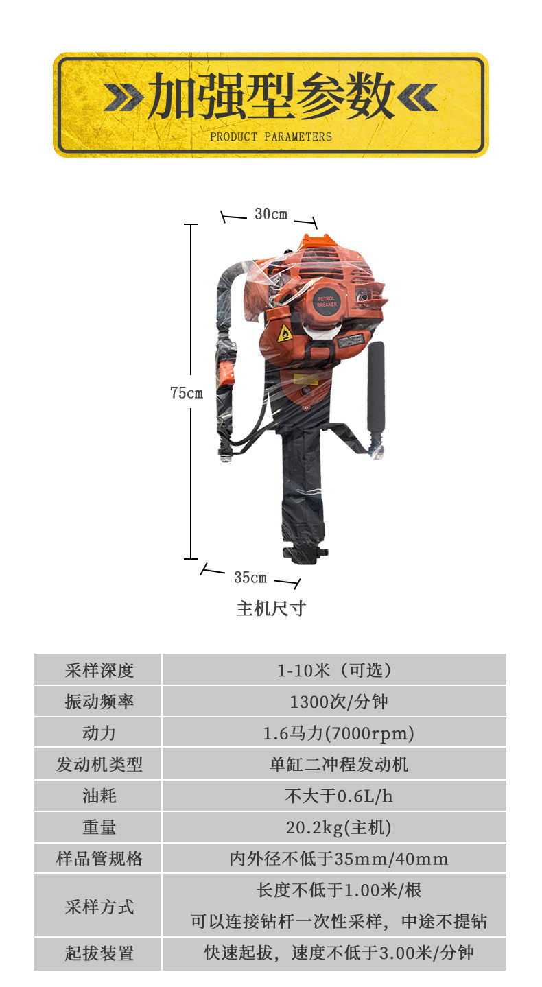 汽油動力發動機一臺,發動機工具包一套,標準土壤鉆頭、硬質土鉆頭隨意選配,不小于1米的鉆桿5根、不小于1米的塑料樣品管2根,刮刀、老虎鉗、耳機、5M卷尺、手套、清潔刷各1個,專用提取設備1套、工業塑料運輸箱1個