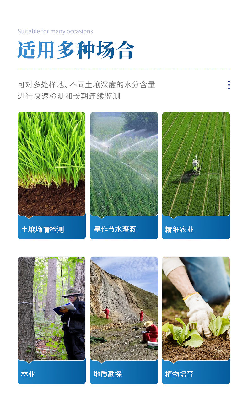 土壤水分測定儀采用FDR頻域反射原理,快速準確測量土壤中含水量,可對多處樣地、不同土壤深度的水分含量進行快速檢測和長期連續監測。廣泛應用于土壤墑情檢測、旱作節水灌溉、精細農業、林業、地質勘探、植物培育等領域。