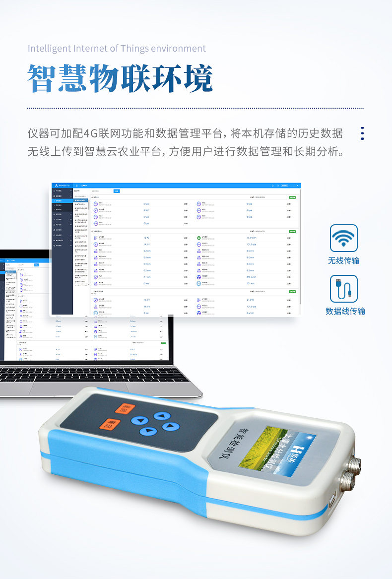 1、☆儀器可加配4G聯網功能和數據管理平臺,將本機存儲的歷史數據無線上傳到智慧云農業平臺,方便用戶進行數據管理和長期分析。