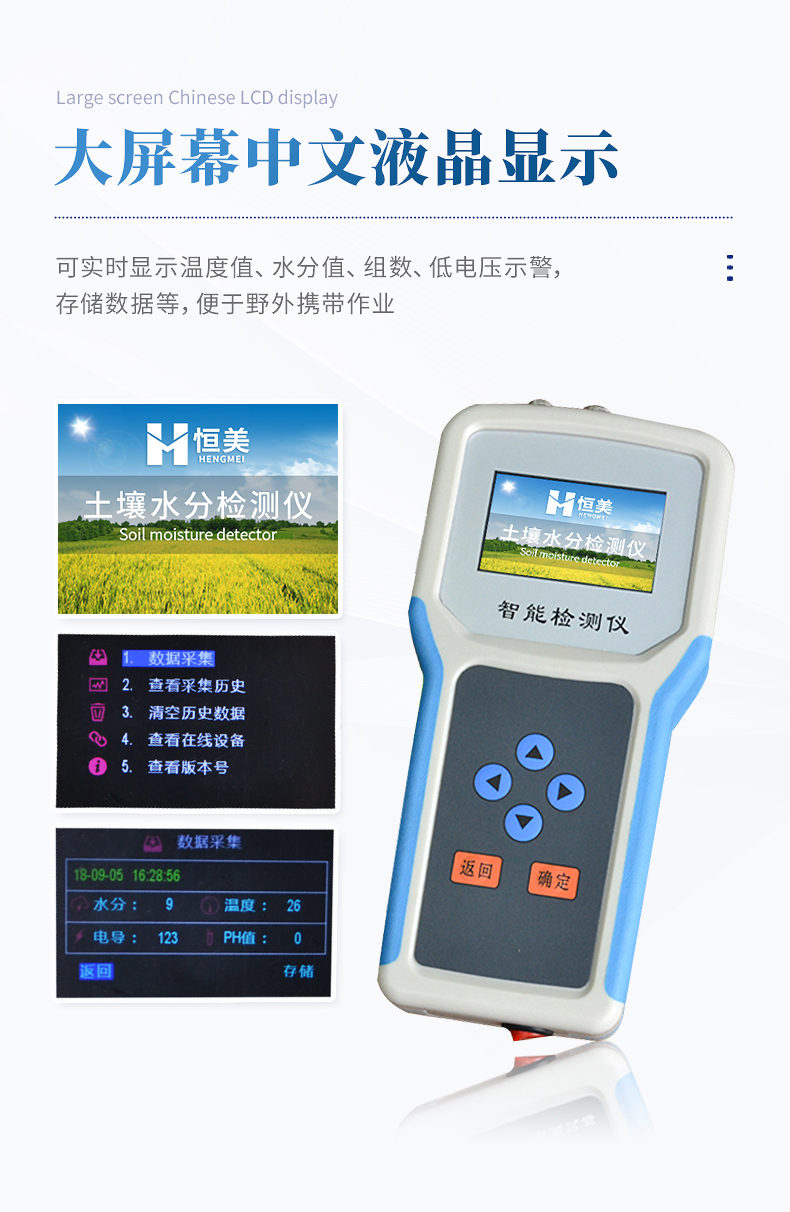 4、大屏幕中文液晶顯示,可實時顯示溫度值、水分值、組數、低電壓示警,存儲數據等,便于野外攜帶作業。